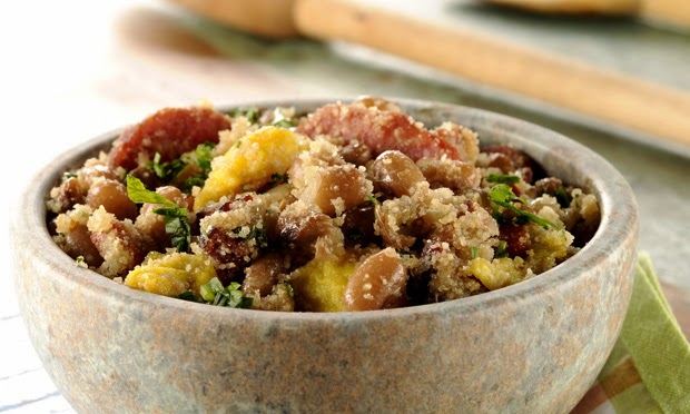 Junte os grãos de feijão, a linguiça, a farinha de mandioca, a cebolinha, a